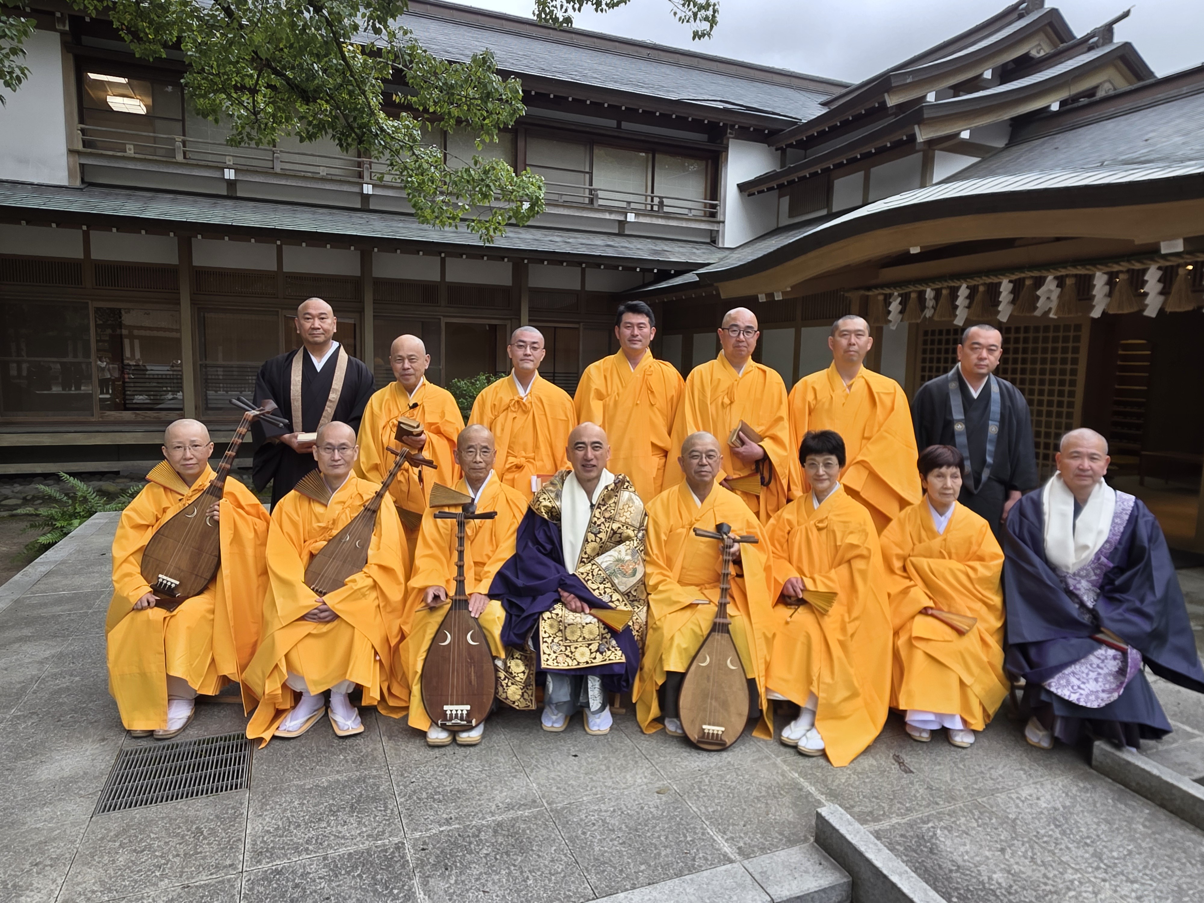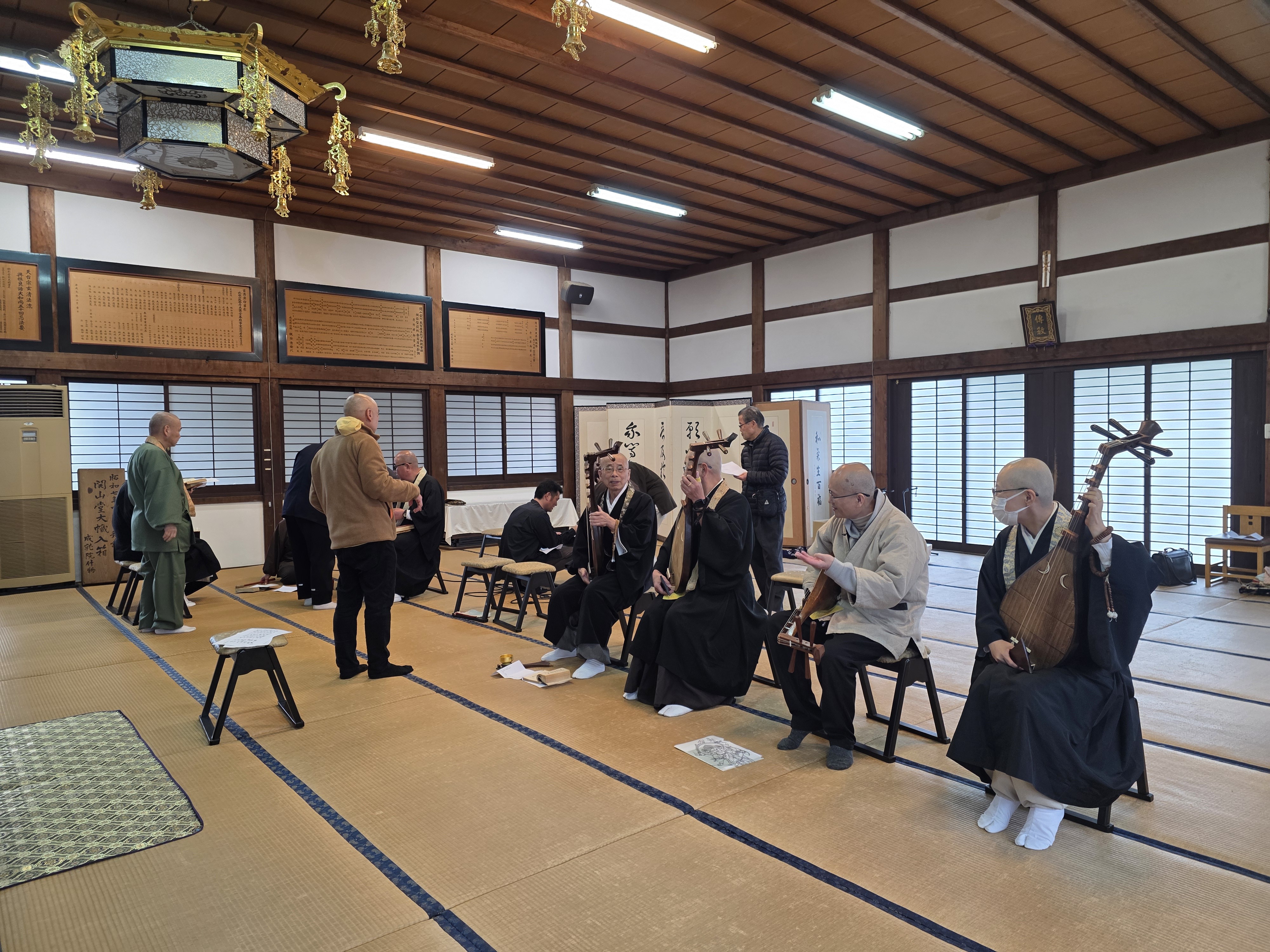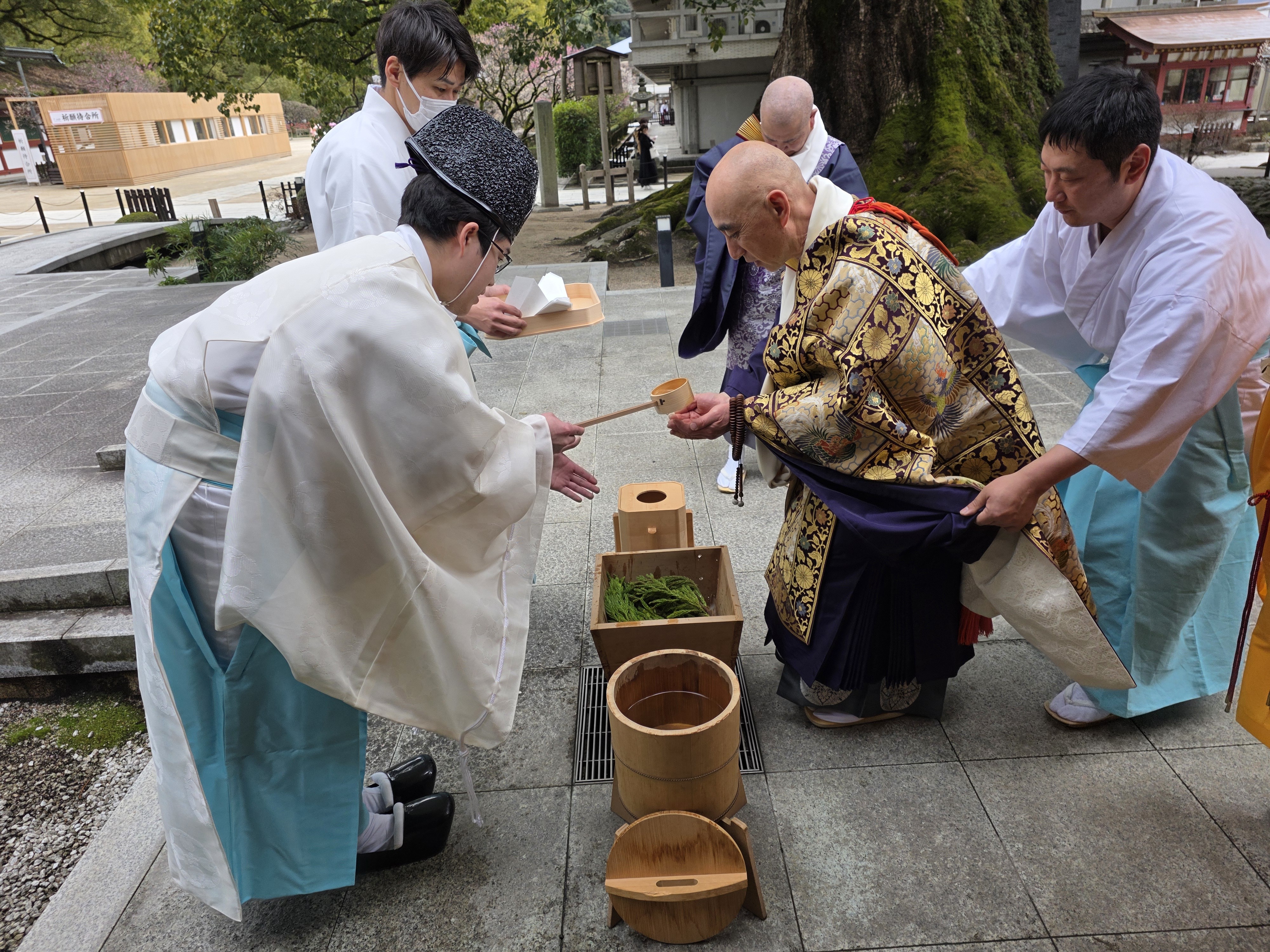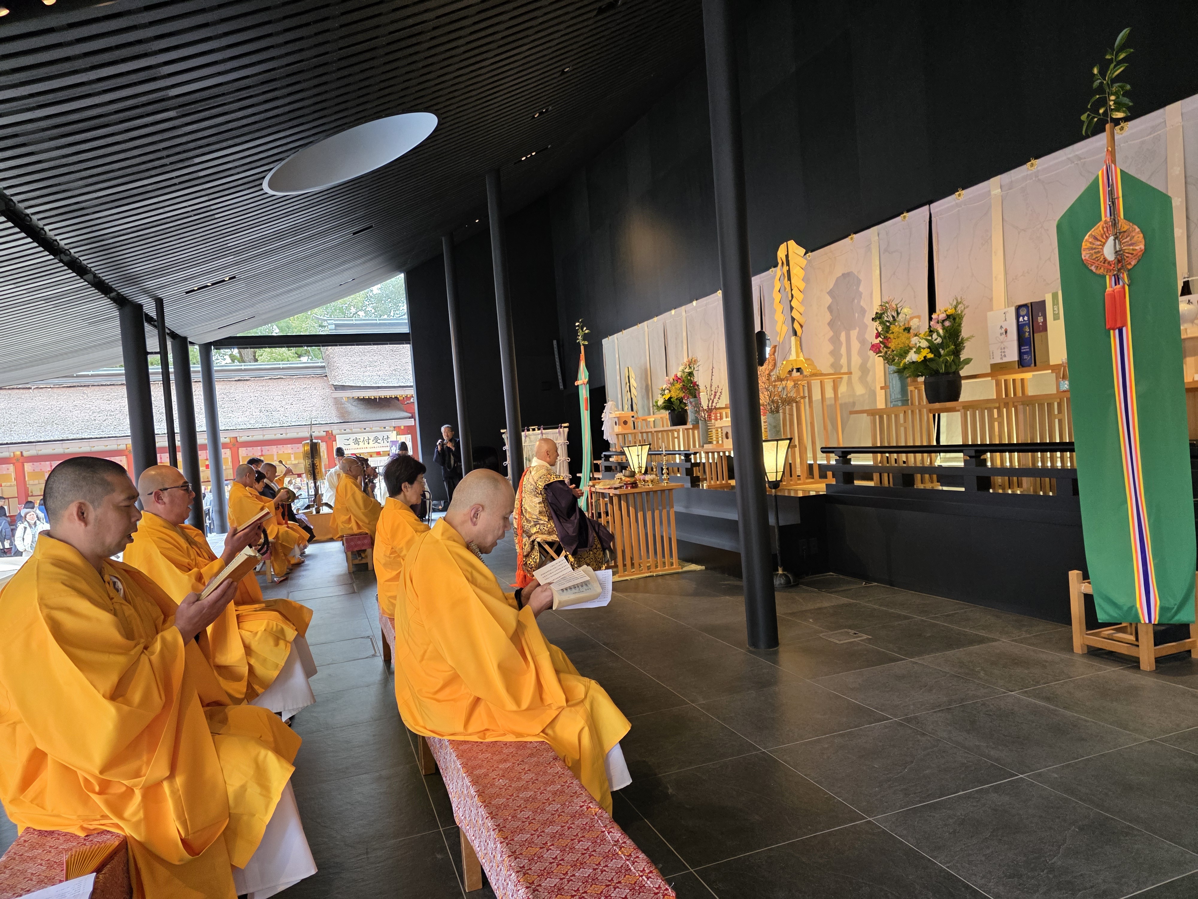 令和8年2月25日太宰府天満宮本殿に於いて菅原道眞公御神前法要が勤修された。2月25日は道眞公の祥月命日にあたり、毎年九州教区の各部内寺院にて法要を勤修している。今年は玄清法流が担当し十数名の僧侶が参集した。今年で最後になる仮本殿の天満宮にはあいにくの天気でったが、たくさんの国内外の参拝客で賑わう姿に道眞公がお喜びになられているかのようであった。