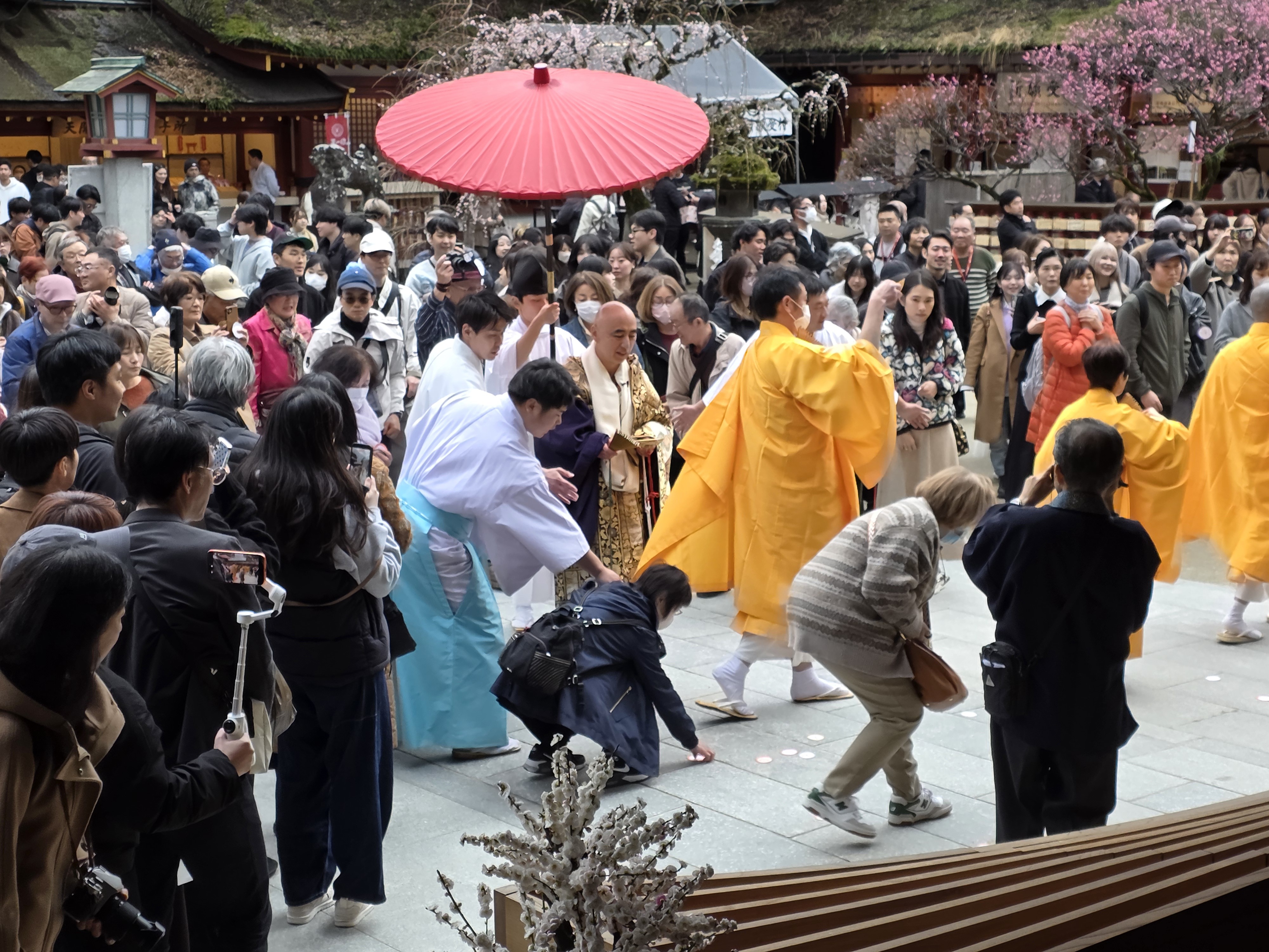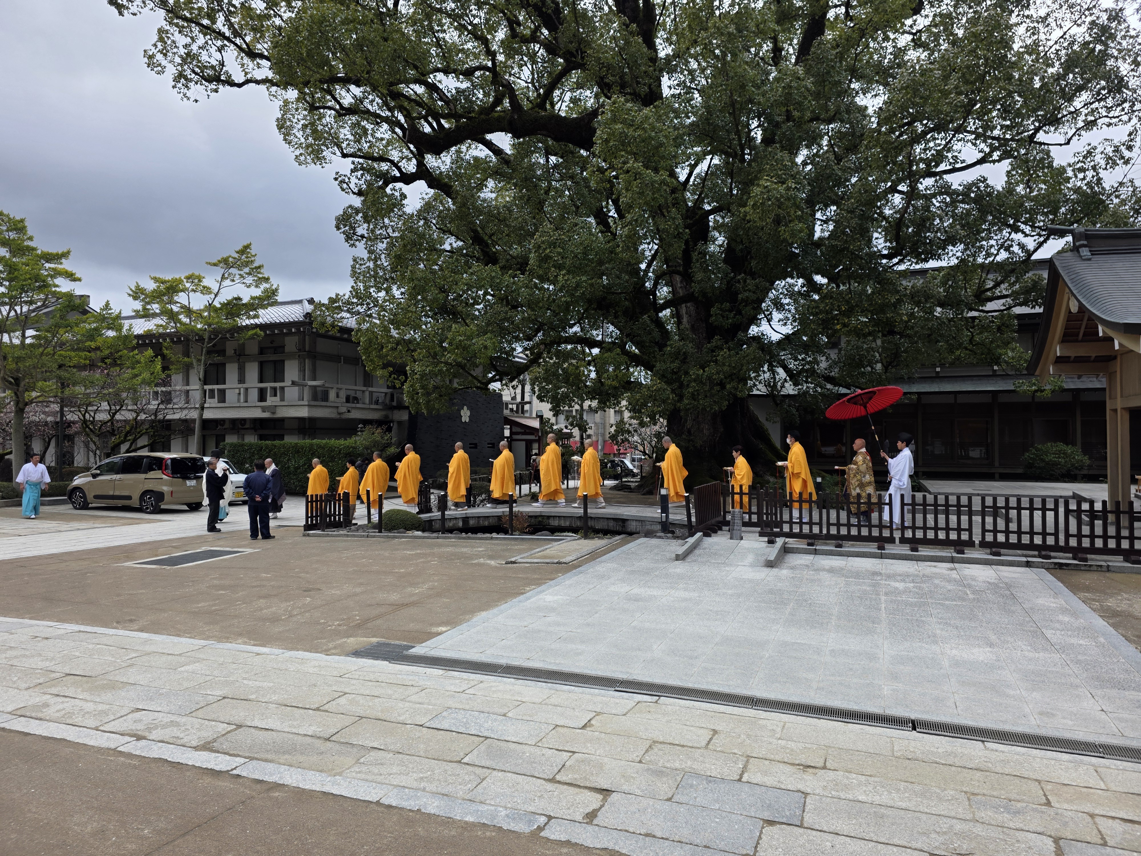 令和8年2月25日太宰府天満宮本殿に於いて菅原道眞公御神前法要が勤修された。2月25日は道眞公の祥月命日にあたり、毎年九州教区の各部内寺院にて法要を勤修している。今年は玄清法流が担当し十数名の僧侶が参集した。今年で最後になる仮本殿の天満宮にはあいにくの天気でったが、たくさんの国内外の参拝客で賑わう姿に道眞公がお喜びになられているかのようであった。